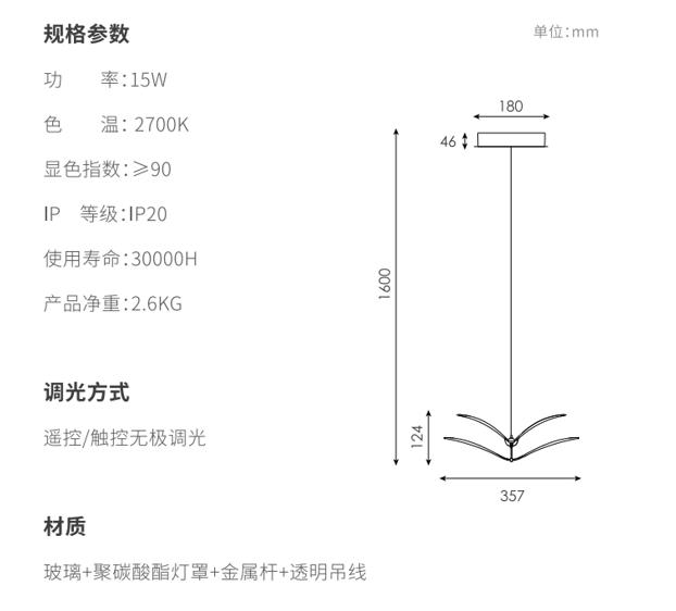 如翼吊灯用双层弯曲的造型作为主要造型特征形成在空间里自由灵动的造型,,以一定的角度倾斜,,,,形成丰富的画面,,两翼的线条均为精心设计,,,,精准控制光线的传播,,将直下光和漫反射光结合,,,70%灯光向下,,,,30%灯光向上,,在空间里形成舒适的光学效果,,下灯罩为片状玻璃印刷专门调制的乳白色油墨,,,热弯成对应弧度,,,灯光透过灯罩呈现出更加柔和的视觉效果;边缘特意留有5mm宽度透明环,,,,使视觉更精致轻巧;灯罩利用两个金属“领夹”式的杆连接固定,,整体视觉优雅;